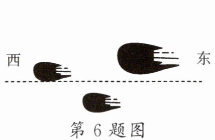 6. 在一条东西方向的平直公路上,一辆沿公路行驶的汽车上有水滴在路面上,路面上部分水滴的印迹如图所示(图中虚线为汽车的行驶路线)。由水滴印迹的特点知汽车行驶方向是由______向______,这是因为水滴离开汽车后,由于______,在水平方向仍保持向前运动的状态,滴到地上后,最初接触地面呈圆形的部分很快停止,其余部分继续向前运动而向前抛洒,因此出现了先圆后不规则的印迹。