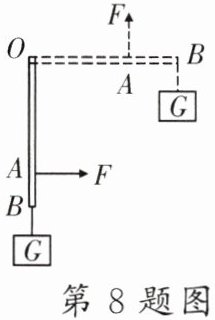 8. 如图所示,O是杠杆的支点,在B点处用细线悬挂一重为G的物体,用一个跟杠杆始终保持垂直的力F作用于A点,使杠杆由竖直位置缓慢转动到水平位置的过程中,则 ()