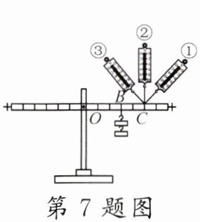 7. 如图所示是小明探究杠杆平衡条件的实验装置,实验中杠杆始终处于水平平衡状态,若在C处逐渐改变弹簧测力计拉力的方向,使其从①→②→③,则拉力的变化情况是 ()