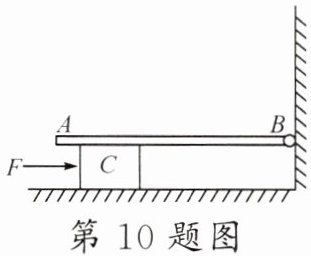 10. 一均匀木板AB,B端固定在墙壁的转轴上,木板可在竖直面内转动,木板下垫了木块C,恰好使木板水平放置,如图所示,现用水平力F将C由A向B匀速推动过程中,推力F将 ()