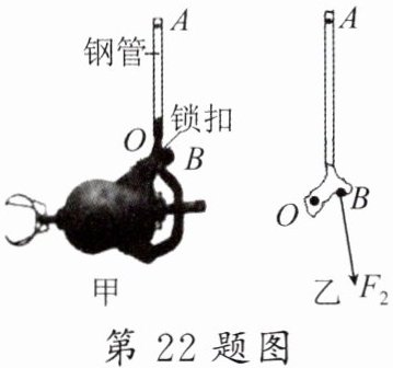 22. 如图甲所示是爆米花锅,锅盖被锁扣紧锁在锅口。为了方便打开锅盖,爆米花师傅在锁扣上插入一个钢管,与锁扣构成杠杆AOB,扳动钢管的A点,就能打开锁扣。图乙是其简化图,O为支点$,F_2$是阻力。请在乙图中画出打开锅盖时,阻力$F_2$的力臂$L_2$以及作用在A点的最小动力$F_1$及其力臂$L_1。$