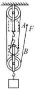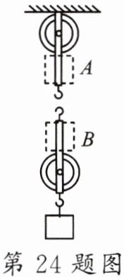 24. 如图所示,在A处或B处的虚线框内添加一个滑轮,利用三个滑轮组成滑轮组,要求使用时最省力,添加滑轮并完成滑轮组绕法。