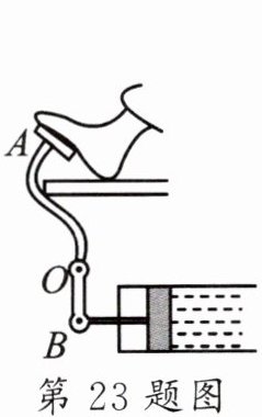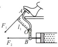 23. 如图所示是汽车液压刹车装置的一部分。该装置中AOB实为一个杠杆,O是杠杆的支点,请画出刹车时它所受的动力$F_1、$阻力$F_2$和动力臂$l_1。$