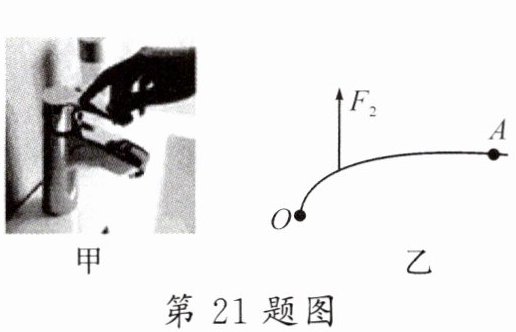 21. 节约用水,人人有责!如图甲所示是用水后及时关闭水龙头时的情景,水龙头手柄看作是一个杠杆,向下按关水,请你在图乙所示的示意图中画出阻力臂$L_2,$并画出施加在A点的最小动力$F_1。$