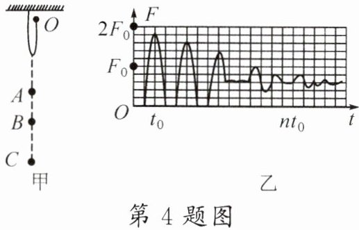 4. 某运动员做蹦极运动,如图甲所示,从高处$O$点下落,$A$点是弹性绳的自由长度,在$B$点运动员所受弹力恰好等于重力,$C$点是第一次下落到达的最低点。运动员所受弹性绳弹力$F的大小随时间t$变化的情况如图乙所示(蹦极过程视为竖直方向上的运动),下列判断正确的是()