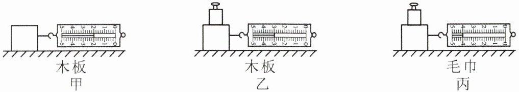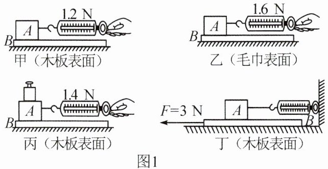 b. 如图1中乙图所示,将毛巾固定在长木板B上,木块A平放在毛巾上,缓缓地匀速拉动木块A,保持弹簧测力计示数稳定,并记录了其示数。