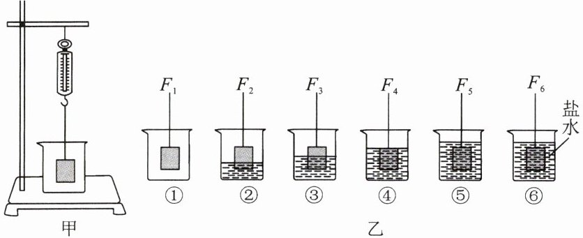 c. 如图乙中⑥所示,再向烧杯中加入适量盐,并轻轻搅拌,直至弹簧测力计示数稳定后读数为$F_6。$