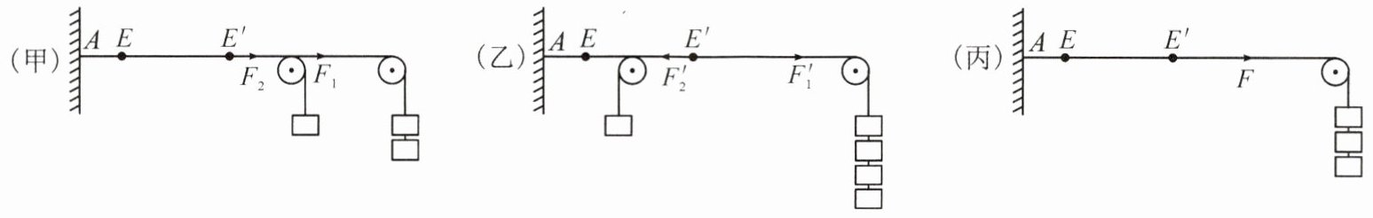 10. 如图为“探究二力合成”的实验情形。橡皮筋原长$AE$,在三次实验中,都被拉伸到$AE'$。