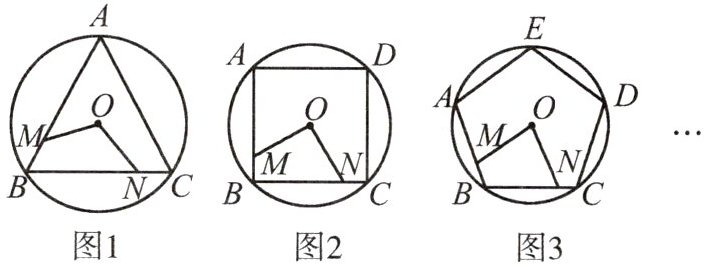 13. 如图,M,N分别是$\odot O$的内接正三角形ABC、正方形ABCD、正五边形ABCDE、…、正n边形ABCDEFG……的边AB,BC上的点,且$BM=CN$,连接OM,ON.