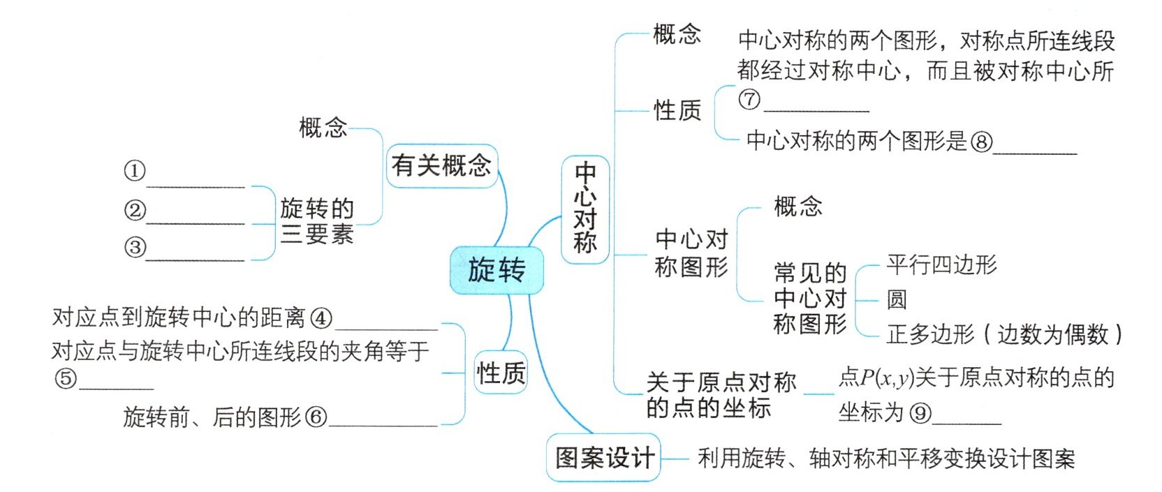 【答案】:①旋转中心;②旋转方向;③旋转角;④相等;⑤旋转角;⑥全等;⑦平分;⑧全等图形;⑨$(-x,-y)$
