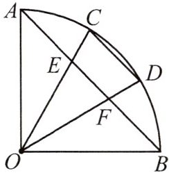 5. 如图,$\angle AOB = 90^{\circ}$,$C$,$D$ 为 $\overset{\frown}{AB}$ 的三等分点,$AB$ 交 $OC$,$OD$ 于点 $E$,$F$。