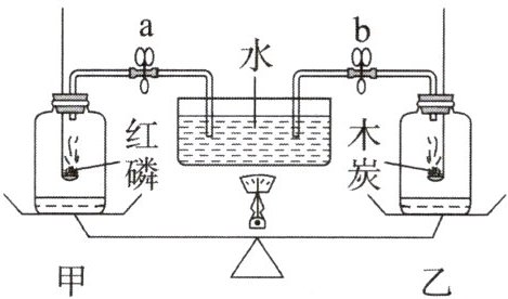 10.如图所示,将等容积(1L)、等质量(包括橡胶塞、导管、燃烧匙)的两集气瓶甲、乙置于天平左右两盘,并调至平衡。关闭弹簧夹a、b,点燃等质量的红磷和木炭,待两者熄灭并冷却至室温后,打开弹簧夹a、b。下列说法正确的是(