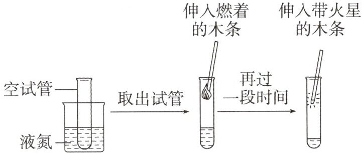 空试管浸入液氮,取出后伸入燃着的木条,再伸入带火星的木条