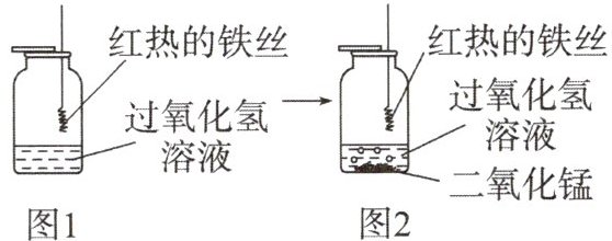 (1) 将加热至红热的铁丝伸入盛有过氧化氢溶液的集气瓶中,如图1所示,铁丝不燃烧;向集气瓶中加入少量二氧化锰,过氧化氢溶液中产生大量气泡,该反应中二氧化锰起