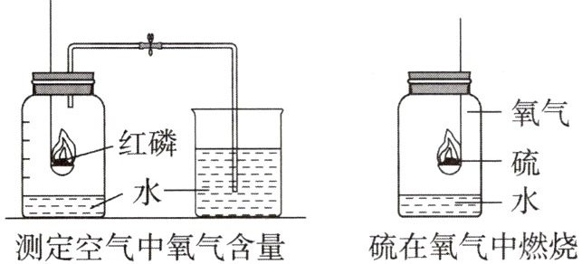 测定空气中氧气含量:集气瓶内有红磷和水,通过导管连接装有水的烧杯,导管上有弹簧夹