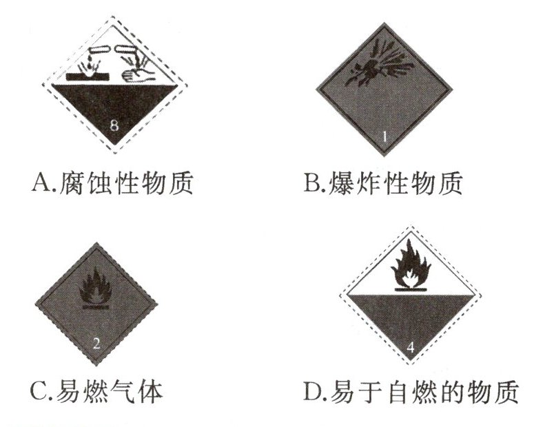 1. (2024·山西中考改编)为保护他人和自己的生命财产安全,运输危险化学品如火药、汽油、浓硫酸等的车辆,必须使用重要的警示标志,其中在运输火药的车辆上应该张贴的是 (