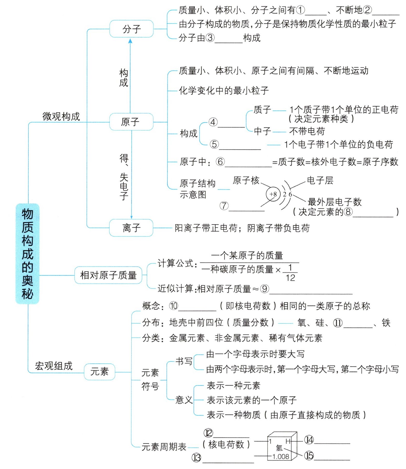 ①间隔 ②运动 ③原子 ④原子核 ⑤核外电子 ⑥核电荷数 ⑦核电荷数 ⑧化学性质 ⑨质子数+中子数 ⑩质子数 ⑪铝 ⑫原子序数 ⑬相对原子质量 ⑭元素符号 ⑮元素名称