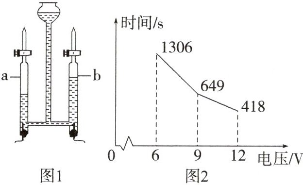 3.(2024·内蒙古赤峰中考)晓佳为探究不同电压对电解水速率的影响,用如图1所示的装置进行多次实验,并记录了不同电压下生成20mL氢气所需时间,如图2所示。下列分析正确的是 (