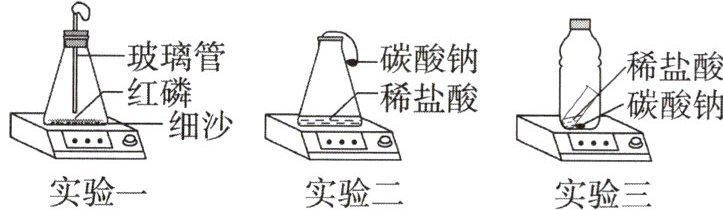 (1)实验一:称量装置和试剂的总质量为$m_{1}$,保持装置密闭。使红磷燃烧,待装置冷却后,再次称量装置和试剂的总质量为$m_{2}$,$m_{1}$与$m_{2}$的大小关系是$m_{1}$