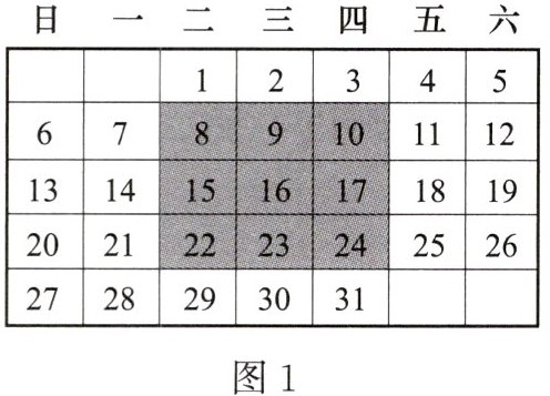 1. 小慧在某年某月的月历中按图1所示方式圈出9个数(如图2),发现这9个数中最大的数与最小的数的乘积是260,则这9个数中,中间的数e是(