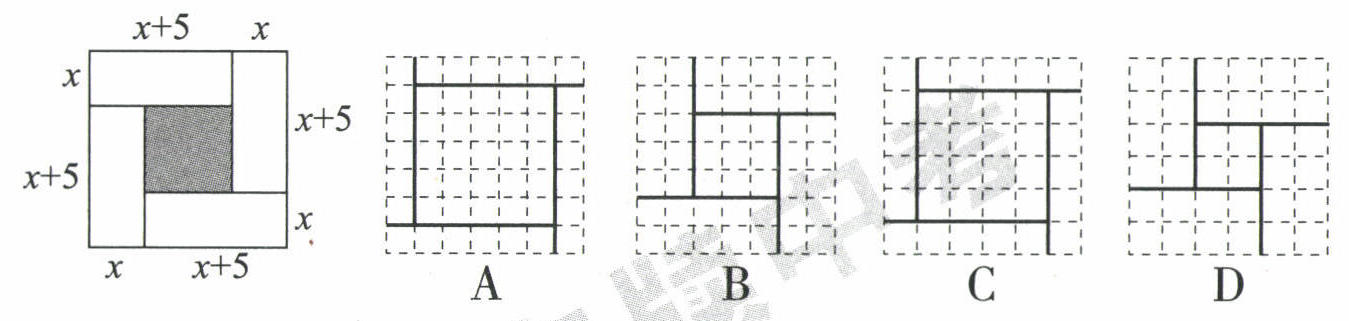 10. 我国古代数学家赵爽(公元3~4世纪)在其所著的《勾股圆方图注》中记载过一元二次方程(正根)的几何解法.以方程 $ x ^ { 2 } + 5 x - 14 = 0 $ 即 $ x ( x + 5 ) = 14 $ 为例,记载的方法是:构造如图面积是 $ ( x + x + 5 ) ^ { 2 } $ 的大正方形,同时它又等于四个矩形的面积加上中间小正方形的面积,即 $ 4 × 14 + 5 ^ { 2 } = 81 $,因此 $ x = 2 $.则在下列四个构图中,能正确说明方程 $ x ^ { 2 } - 3 x - 10 = 0 $ 的解法的构图是
