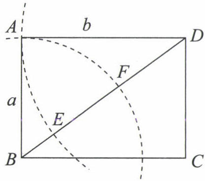 9. 如图,在长方形 $ A B C D $ 中,以点 $ D $ 为圆心, $ A D $ 长为半径作弧与 $ B D $ 交于点 $ E $;以点 $ B $ 为圆心, $ A B $ 长为半径作弧与 $ B D $ 交于点 $ F $.设 $ A B = a $, $ A D = b $,则方程 $ x ^ { 2 } + 2 a x = b ^ { 2 } $ 的一个正根是