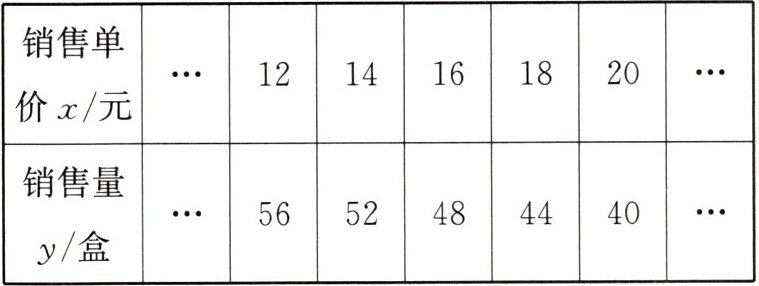 10. [2024·贵州中考]某超市购入一批进价为10元/盒的糖果进行销售,经市场调查发现:销售单价不低于进价时,日销售量y(盒)与销售单价x(元)是一次函数关系,下表是y与x的几组对应值.