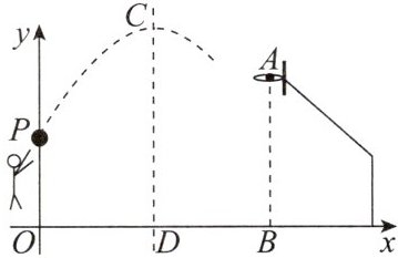 素材1:在初次投篮时,小红测得$ O P = 2.2 $米,篮筐高$ A B = 3 $米,$ O B = 6 $米,篮球距离地面的最大高度$ C D = 4 $米,此时$ O D = 3 $米.