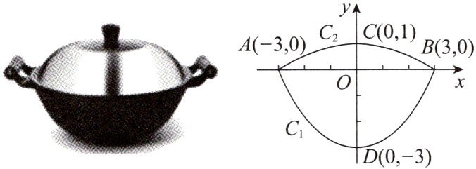 7. [情境题][2024·淮南期中]我们常见的炒菜锅和锅盖都是抛物线面,经过锅心和盖心的纵断面是两段抛物线组合而成的封闭图形,不妨简称为“锅线”.现有一炒菜锅锅口直径为6dm,锅深3dm,锅盖高1dm(锅口直径与锅盖直径视为相同),建立平面直角坐标系如图所示,把锅纵断面的抛物线记为$ C _ { 1 } $,把锅盖纵断面的抛物线记为$ C _ { 2 } $.