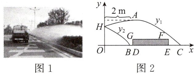 【数学建模】如图2建立平面直角坐标系,可以把洒水车喷出水的内、外边缘抽象为两条抛物线. 喷水口的竖直高度OH为1.5m,绿化带横截面是矩形DEFG,且$DE= 3m$,$EF= 0.5m$. 内边缘抛物线$y_{2}是由外边缘抛物线y_{1}$向左平移得到,且抛物线$y_{1}$的最高点A与喷水口的水平距离为2m,与喷水口的竖直距离为0.5m.