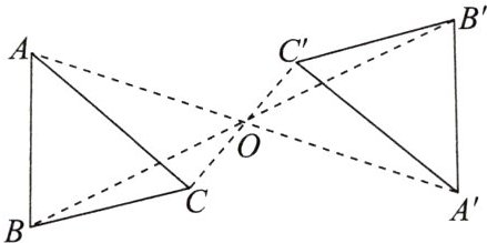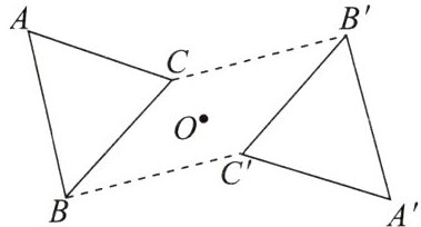 连接$BB'$,$CC'$。由旋转角为$180^{\circ }$,得点$B$,$O$,$B'$共线,点$C$,$O$,$C'$共线,易知$BO=B'O$,$CO=C'O$,∴ 四边形$BCB'C'$是平行四边形。