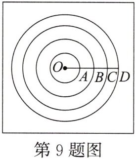 9. [教材P81练习第2题改编]如图是一个由四个同心圆构成的靶子示意图,点O为圆心,且$OA = AB = BC = CD = 5$,那么周长最接近100的圆的半径是(