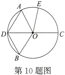 10. 如图,半径OA,OB,OC将一个圆分成三个大小相同的扇形,其中弦$AD= BD,\widehat {AE}= \frac {1}{2}\widehat {CE}$,则$∠DOE$等于 (