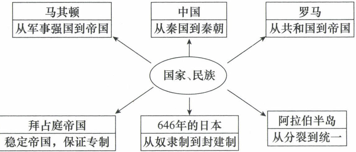 论述:马其顿国王亚历山大东征,建立地跨亚、非、欧三洲的大帝国,促进了东西方文化的大交汇。战国时期,秦国经过商鞅变法,国力增强,为以后统一全国奠定了基础。公元前27年,屋大维首创“元首制”,罗马共和国演变为罗马帝国。拜占庭帝国在查士丁尼统治时期,组织编纂《罗马民法大全》,奠定了欧洲民法的基础。646年,孝德天皇进行了大化改新,使日本成为一个中央集权制的封建国家。7世纪初,穆罕默德创立了伊斯兰教,推动了阿拉伯半岛统一。(4分)