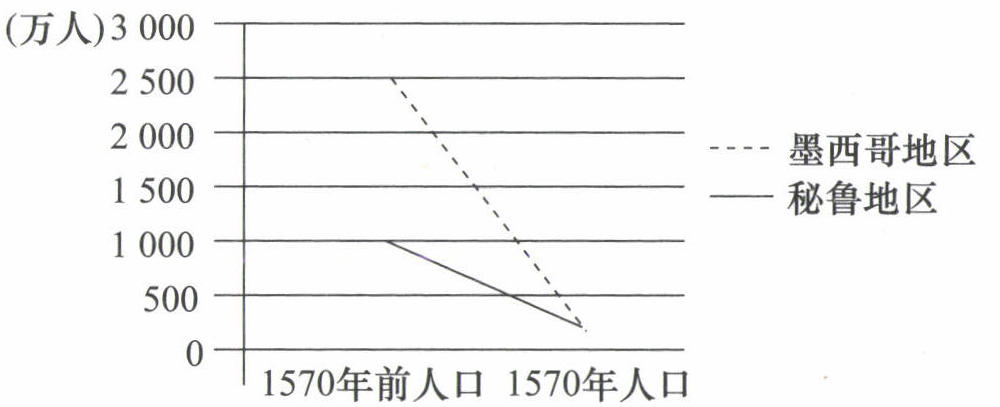 D 【解析】观察题干图片可知,墨西哥和秘鲁地区在这一时期人口急剧减少,结合所学知识可知,这是由于殖民者在殖民过程中对印第安人实行种族灭绝造成的,D项正确。