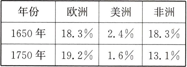 10. [绘制统计表]下表是李华同学绘制的1650—1750年欧洲、美洲、非洲的人口占世界人口百分比的变化情况统计表。据此表推知(