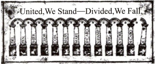 5. [跨学科·英语]下图是 1790 年创作的一幅漫画《联合则生,分裂则亡》,漫画中的十三根支柱代表美国的十三个州,按照各州批准宪法的先后顺序从左到右排列。该漫画创作的时代背景是(
