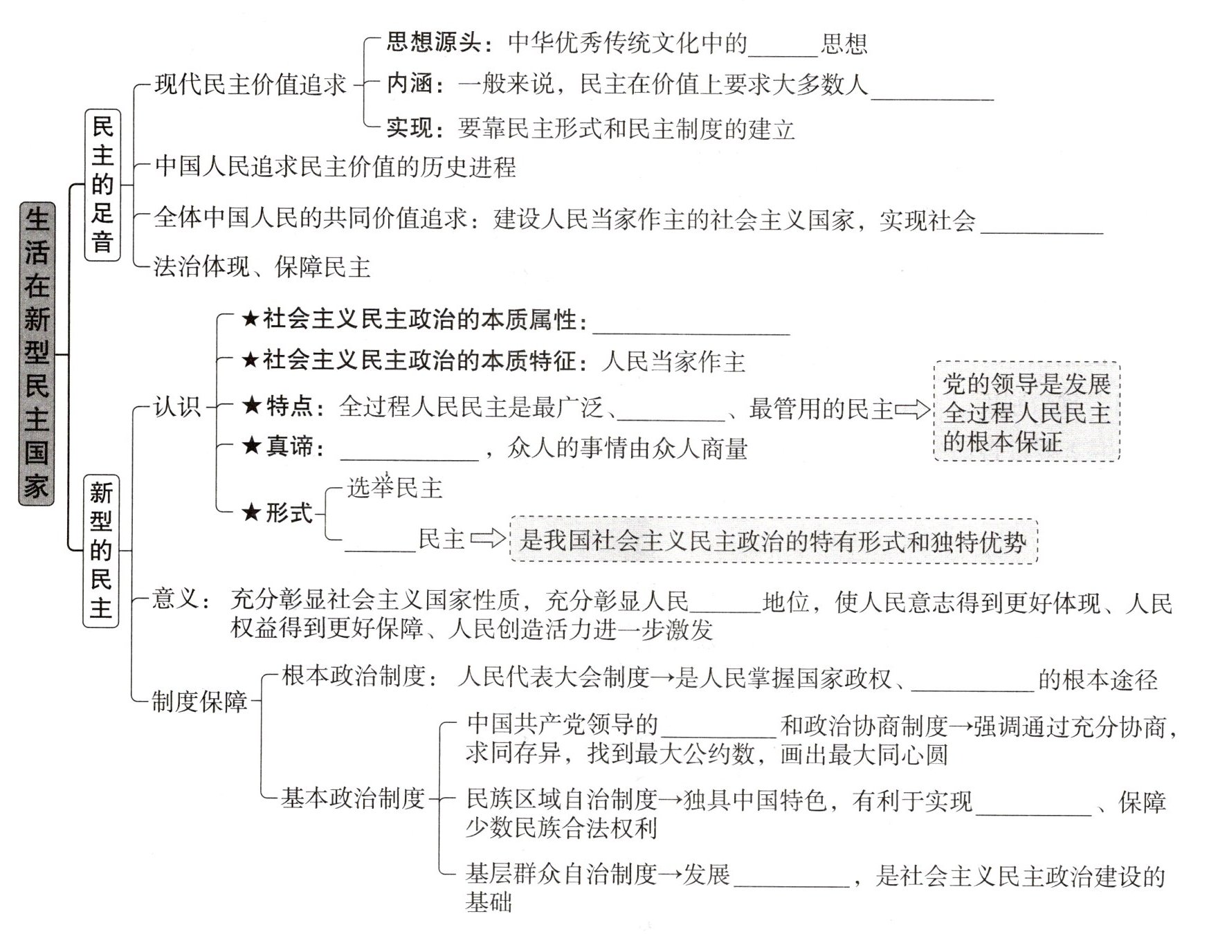 答案: 民本 当家作主 公平正义 全过程人民民主 最真实 有事好商量 协商 主体 行使权力 多党合作 民族平等 基层民主