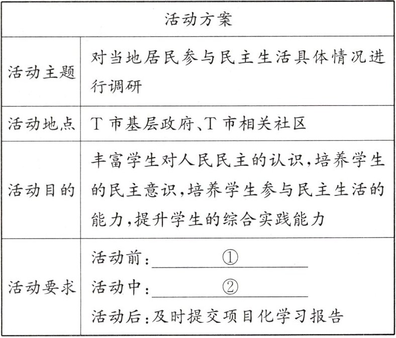 9. 木牍原创[新课标·项目式](14分)为了切实感受人民当家作主,九年级学生小琪和几名同学决定利用假期开展项目式学习活动,对当地居民参与民主生活的具体情况进行调研,请你参与。