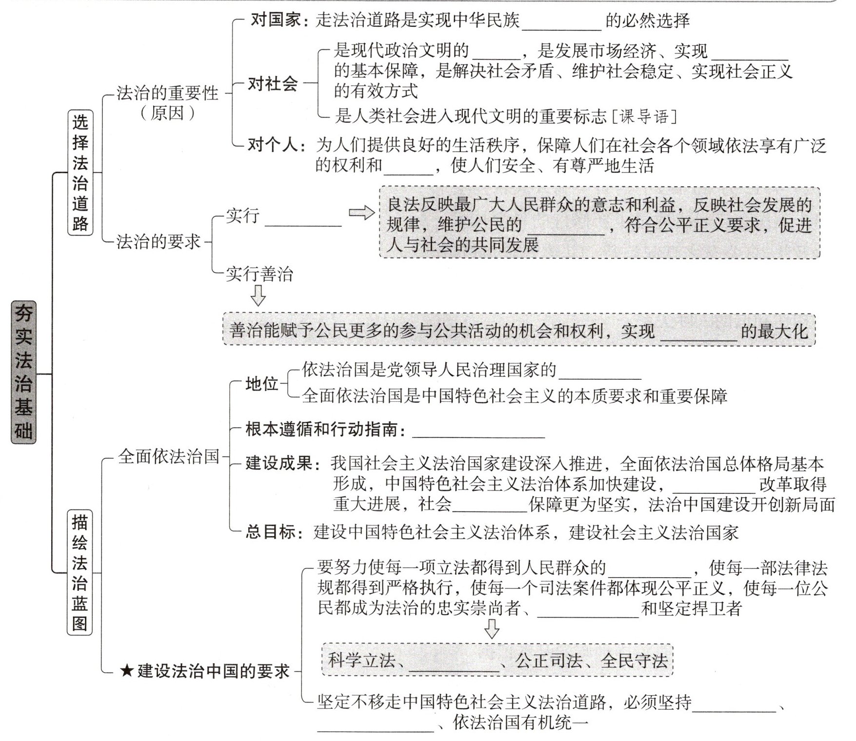 答案: 伟大复兴 核心 强国富民 自由 良法之治 基本权利 公共利益 基本方略 习近平法治思想 司法体制 公平正义 普遍拥护 自觉遵守者 严格执法 党的领导 人民当家作主
