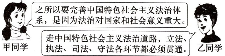 党的二十届三中全会指出,完善中国特色社会主义法治体系,全面推进国家各方面工作法治化。同学们对此有下列看法。