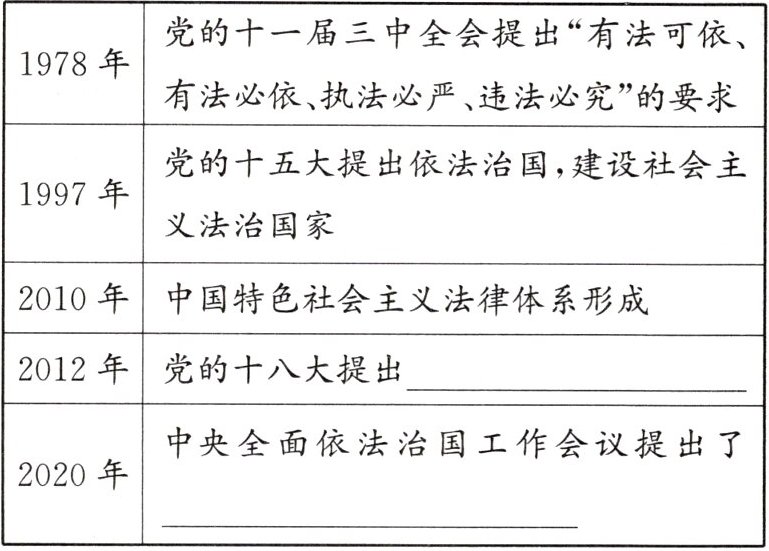 (1)①全面推进依法治国。(1分)习近平法治思想。(1分)②习近平法治思想是全面依法治国的根本遵循和行动指南。(2分)