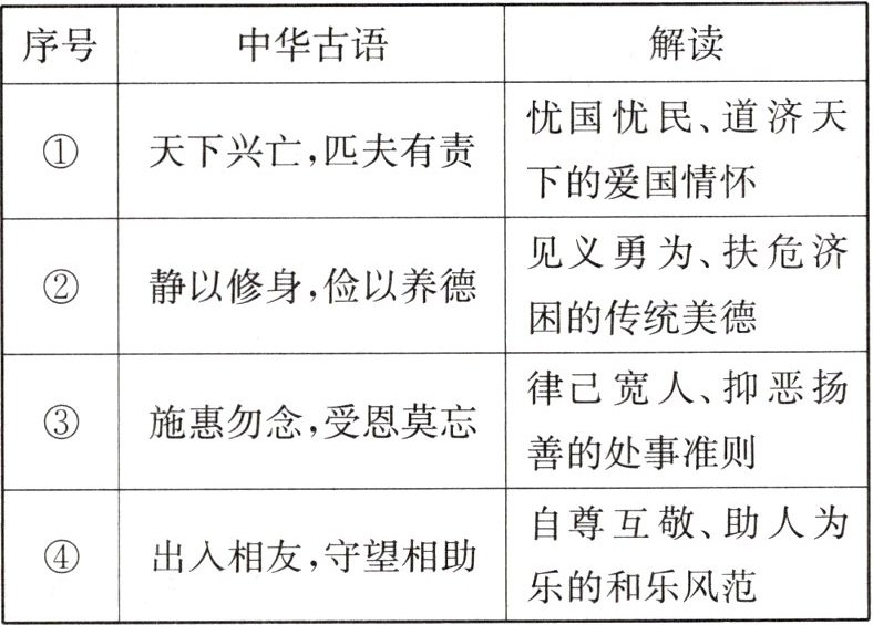 B 【解析】“静以修身,俭以养德”体现了修身养性、勤俭节约的传统美德,“施惠勿念,受恩莫忘”体现了关爱他人、知恩感恩的处事准则,②③错误。①④解读正确。