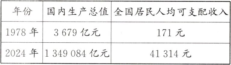 (2)①结论:坚持改革开放,极大解放和发展了社会生产力;中国人民通过改革开放过上了幸福生活等。(2分,答出一点即可)②(党和人民角度)坚持中国共产党的领导;全国各族人民的努力奋斗。(2分,答出一点即可)(经济角度)实行改革开放;坚持以经济建设为中心,大力发展生产力;坚持社会主义基本经济制度。(2分,答出一点即可)
