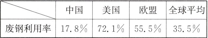 4. 废钢是钢铁工业的绿色原料,用废钢生产1吨钢,可节约铁矿石1.6吨,减少能耗0.35吨标准煤,减少二氧化碳排放1.6吨。下表为主要国家或地区废钢利用率对比: