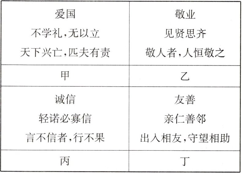 D 【解析】“轻诺必寡信”“言不信者,行不果”体现了诚信;“亲仁善邻”“出入相友,守望相助”体现了友善,D项正确。“天下兴亡,匹夫有责”体现了爱国,“不学礼,无以立”强调文明有礼;“见贤思齐”强调向榜样学习,“敬人者,人恒敬之”体现了尊重他人,甲同学和乙同学所选名言名句主旨与主题词不一致,A、B、C三项错误。