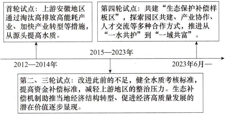 |首轮试点:上游安徽地区通过淘汰高排放高能耗产业、加快产业转型等措施,从源头提高水质。|第四轮试点:共建“生态保护补偿样板区”,探索园区共建、产业协作、人才交流等多种合作方式,推进从“一水共护”到“一域共富”。|