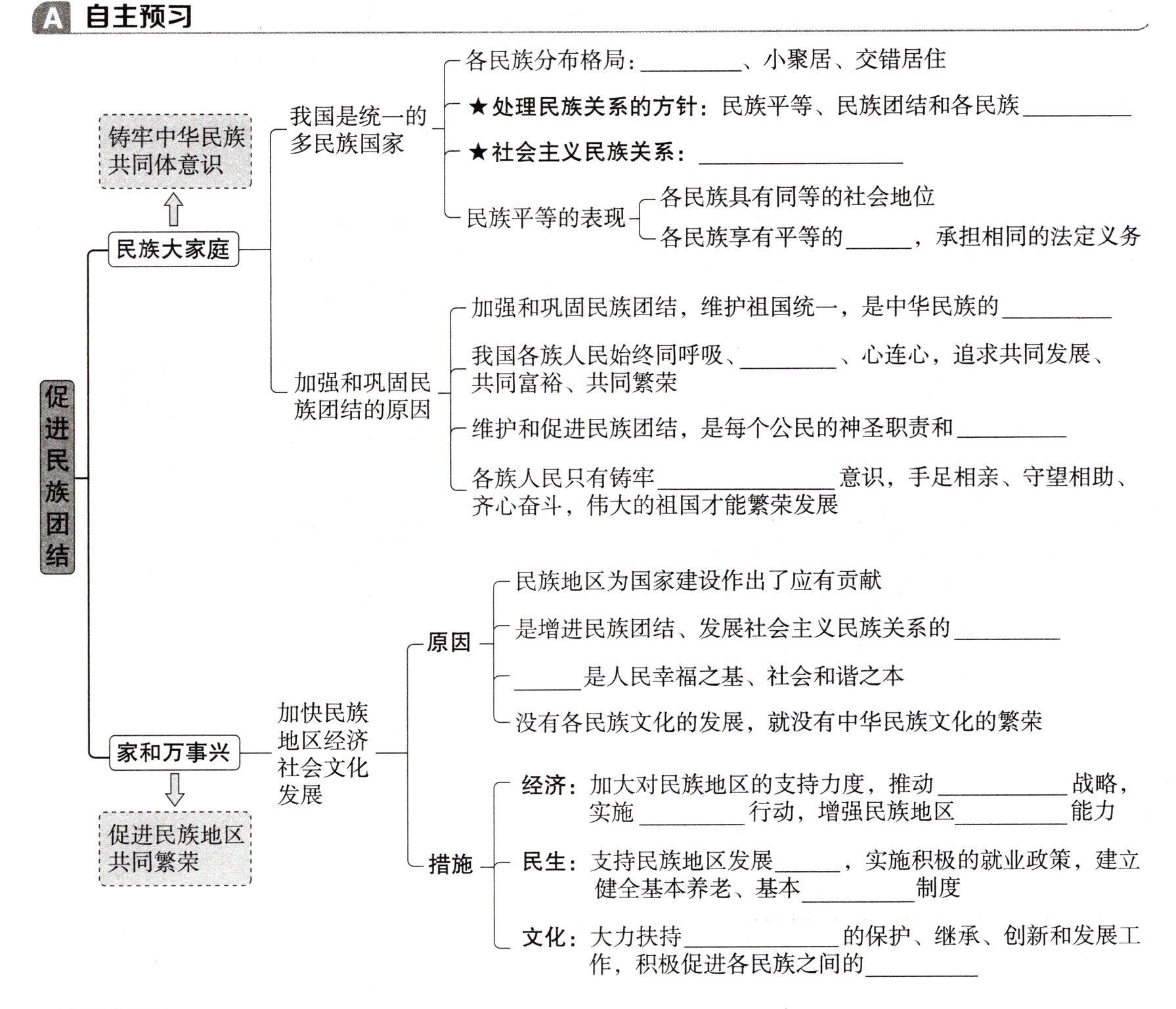 答案: 大杂居 共同繁荣 平等团结互助和谐 权利 最高利益 共命运 光荣义务 中华民族共同体 必由之路 民生 西部大开发 兴边富民 自我发展 教育 医疗保险 少数民族文化 文化交流