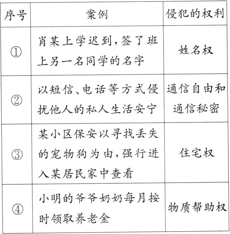3. 下面表格中的案例与侵犯的权利对应正确的是 ()
