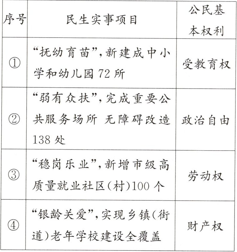2. 民生实事项目关乎公民基本权利和人民幸福生活的实现。下表中某市实施的民生实事项目与其所保障的公民基本权利对应一致的是 ()